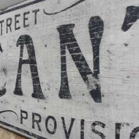 As pictured distressed black background with off white letters, can be customized.